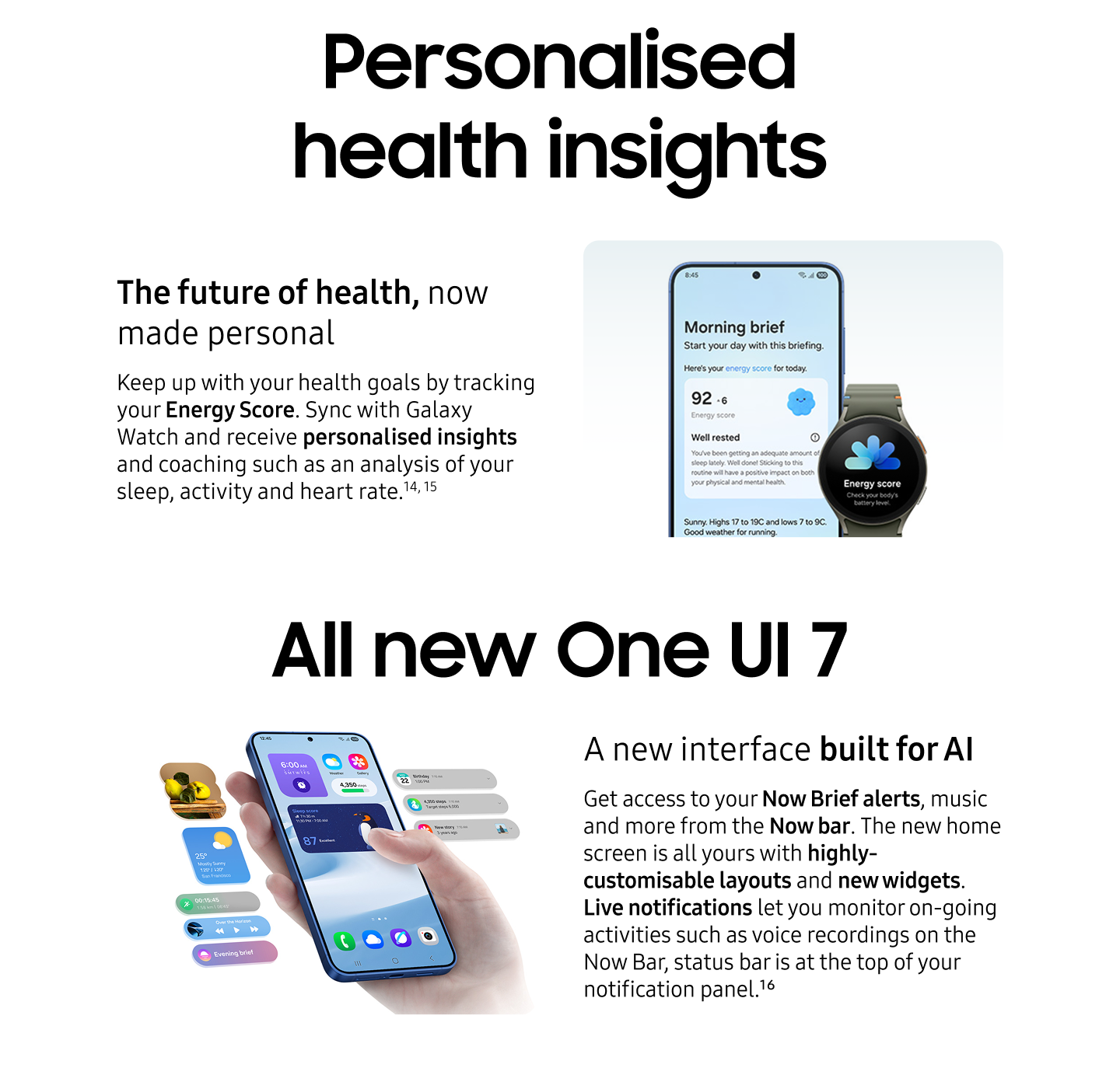 6.2-inch Dynamic AMOLED 2X display with Full HD+ resolution (1080 x 2340) and 120Hz refresh rate ensures all your entertainment looks incredible. It's protected by Corning Gorilla Glass Victus 2, while IP68 dust & water resistance mean it's a tough cookie too. Powered by the new Snapdragon 8 Elite processor and 12GB RAM, everything is super-fast and buttery smooth too.
