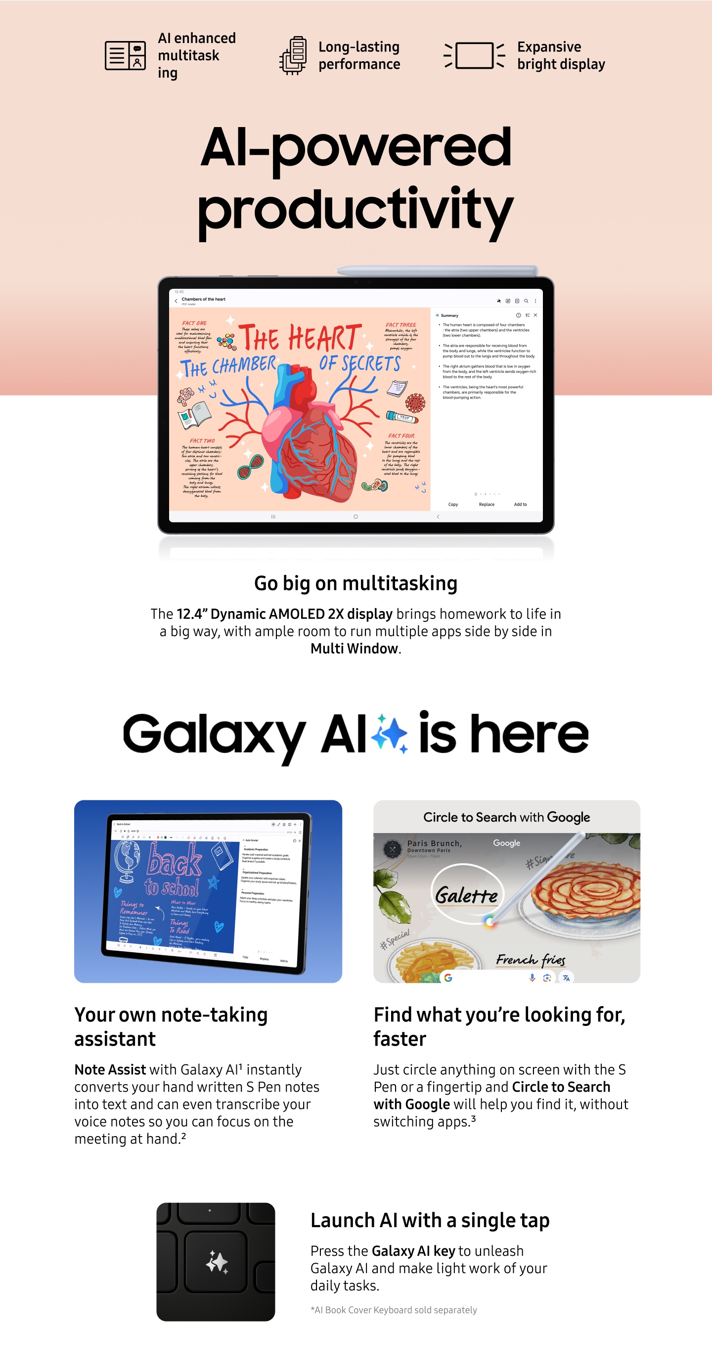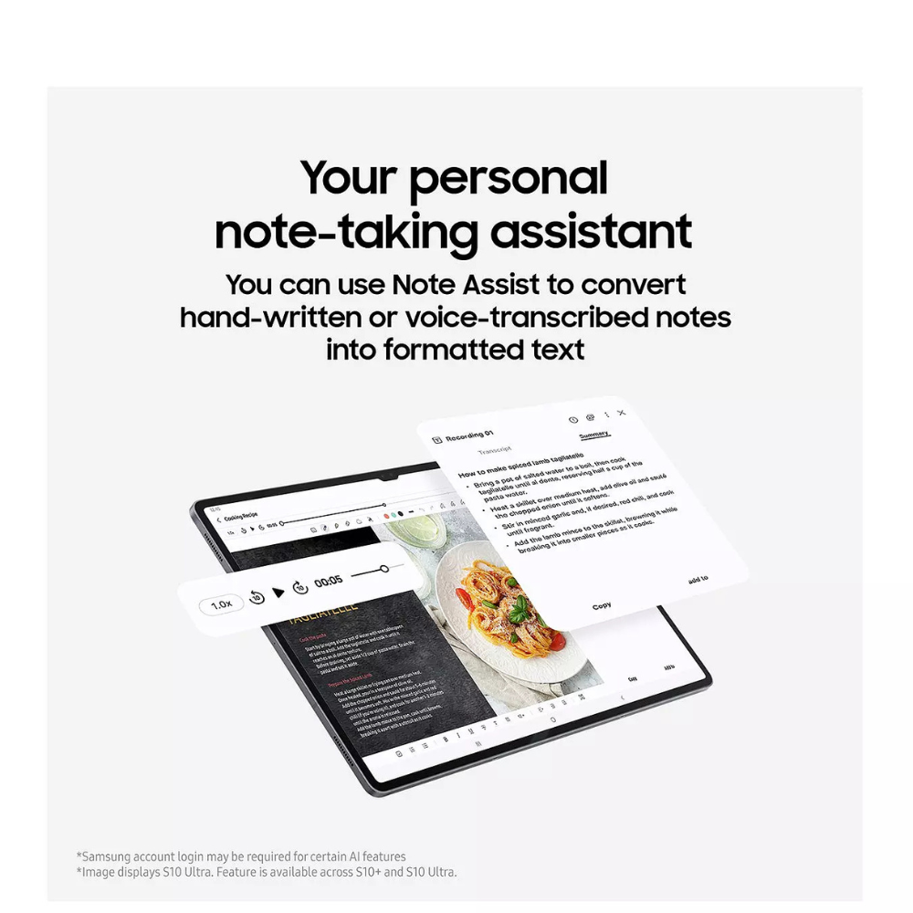 UNLEASH THE POWER OF GALAXY AIThe ways AI can make your life easier are unfolding all the time and the Tab S10+ is here to hurry along that process. Note Assist will convert what your write with the included S Pen to text instantly1. When helping with homework, Math Assist2 will convert your workings out into text and can even help calculate them. And for a PC like experience simply attach the AI Book Cover Keyboard3. Then there's Circle to Search with Google4, which makes searching even easier. Plus, with Photo Assist, you can remove glare and unwanted objects from your photos, so they're completely social ready.